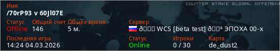 Играет на Counter Strike Global Offensive сервере. Страна: РоссияПервый раз замечен 14:16 04.03.2026