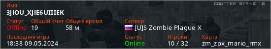Играет на Counter Strike 1.6 сервере. Страна: РоссияПервый раз замечен 16:47 20.12.2022
