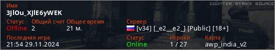 Играет на Counter Strike Source сервере. Страна: РоссияПервый раз замечен 19:43 29.11.2023