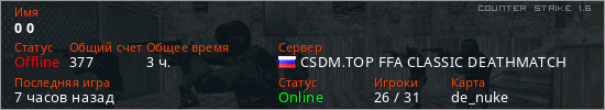 Играет на Counter Strike 1.6 сервере. Страна: РоссияПервый раз замечен 21:57 06.03.2026