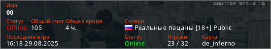 Играет на Counter Strike 1.6 сервере. Страна: РоссияПервый раз замечен 21:48 11.02.2023