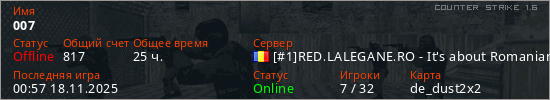 Играет на Counter Strike 1.6 сервере. Страна: РумынияПервый раз замечен 07:39 10.05.2022
