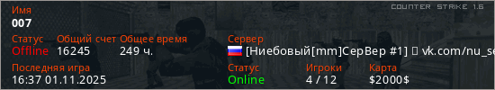 Последний раз был в сети 16:37 01.11.2025 Игрок с таким ником замечен на 65 серверах