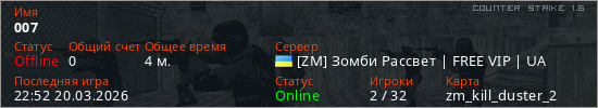 Играет на Counter Strike 1.6 сервере. Страна: УкраинаПервый раз замечен 22:48 20.03.2026