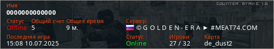 Играет на Counter Strike 1.6 сервере. Страна: РоссияПервый раз замечен 18:53 27.07.2023