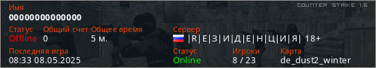 Играет на Counter Strike 1.6 сервере. Страна: РоссияПервый раз замечен 08:21 08.05.2025