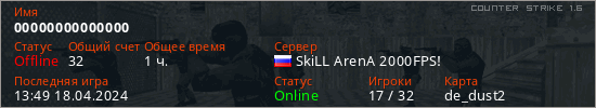 Играет на Counter Strike 1.6 сервере. Страна: РоссияПервый раз замечен 12:59 13.04.2024