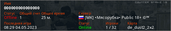Играет на Counter Strike 1.6 сервере. Страна: РоссияПервый раз замечен 07:15 04.05.2023