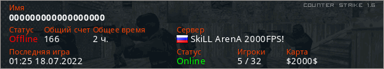 Играет на Counter Strike 1.6 сервере. Страна: РоссияПервый раз замечен 23:27 07.07.2022