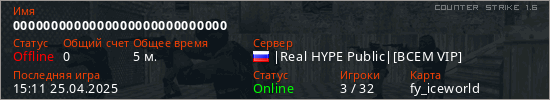 Играет на Counter Strike 1.6 сервере. Страна: РоссияПервый раз замечен 15:09 25.04.2025