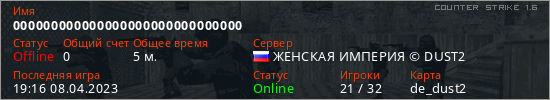 Играет на Counter Strike 1.6 сервере. Страна: РоссияПервый раз замечен 19:00 08.04.2023