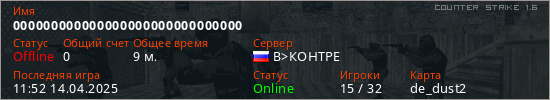 Играет на Counter Strike 1.6 сервере. Страна: РоссияПервый раз замечен 11:37 14.04.2025