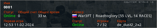 Играет на Counter Strike 1.6 сервере. Страна: РоссияПервый раз замечен 12:53 11.02.2024