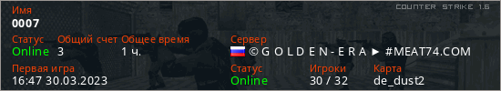Играет на Counter Strike 1.6 сервере. Страна: РоссияПервый раз замечен 16:47 30.03.2023