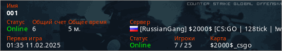 Играет на Counter Strike Global Offensive сервере. Страна: РоссияПервый раз замечен 01:35 11.02.2025