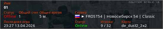 Играет на Counter Strike 1.6 сервере. Страна: РоссияПервый раз замечен 22:49 13.04.2026