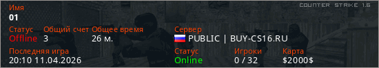 Играет на Counter Strike 1.6 сервере. Страна: РоссияПервый раз замечен 10:15 24.03.2026