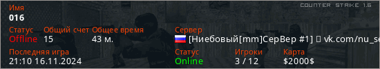 Играет на Counter Strike 1.6 сервере. Страна: РоссияПервый раз замечен 16:51 09.01.2021