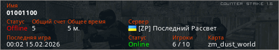 Играет на Counter Strike 1.6 сервере. Страна: УкраинаПервый раз замечен 23:43 14.02.2026