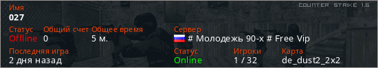 Играет на Counter Strike 1.6 сервере. Страна: РоссияПервый раз замечен 17:51 04.12.2025