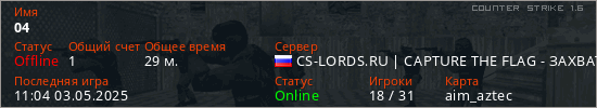 Играет на Counter Strike 1.6 сервере. Страна: РоссияПервый раз замечен 23:52 22.03.2023