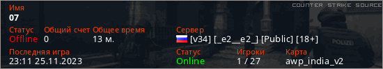 Играет на Counter Strike Source сервере. Страна: РоссияПервый раз замечен 00:49 21.11.2023