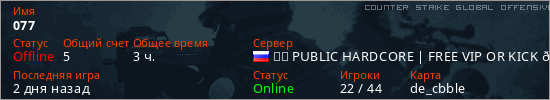 Играет на Counter Strike Global Offensive сервере. Страна: РоссияПервый раз замечен 18:58 25.07.2025
