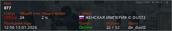 Играет на Counter Strike 1.6 сервере. Страна: РоссияПервый раз замечен 08:54 01.01.2023