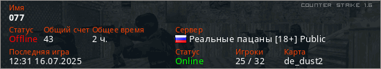Последний раз был в сети 12:31 16.07.2025 Игрок с таким ником замечен на 40 серверах