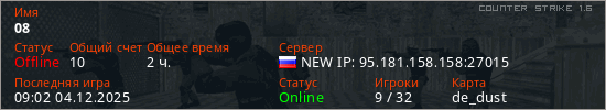 Играет на Counter Strike 1.6 сервере. Страна: РоссияПервый раз замечен 11:51 10.08.2025