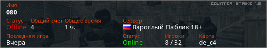 Играет на Counter Strike 1.6 сервере. Страна: РоссияПервый раз замечен 09:23 08.09.2020