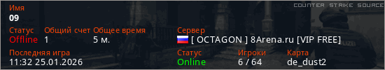 Играет на Counter Strike Source сервере. Страна: РоссияПервый раз замечен 11:29 25.01.2026