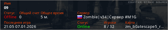 Играет на Counter Strike Source сервере. Страна: РоссияПервый раз замечен 20:53 07.01.2026