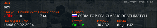 Играет на Counter Strike 1.6 сервере. Страна: РоссияПервый раз замечен 14:47 09.02.2024