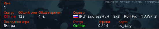 Играет на Counter Strike Global Offensive сервере. Страна: РоссияПервый раз замечен 20:09 05.09.2025