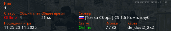Последний раз был в сети 11:25 23.11.2025 Игрок с таким ником замечен на 81 сервере