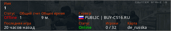 Играет на Counter Strike 1.6 сервере. Страна: РоссияПервый раз замечен 20:54 08.03.2026
