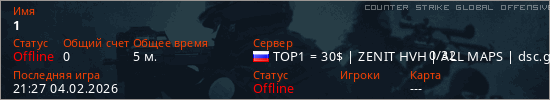 Играет на Counter Strike Global Offensive сервере. Страна: РоссияПервый раз замечен 20:49 04.02.2026