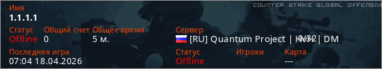 Играет на Counter Strike Global Offensive сервере. Страна: РоссияПервый раз замечен 06:51 18.04.2026