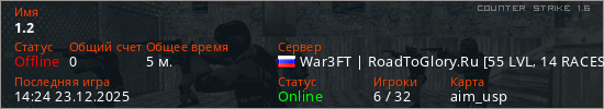 Играет на Counter Strike 1.6 сервере. Страна: РоссияПервый раз замечен 14:19 23.12.2025