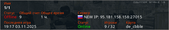 Играет на Counter Strike 1.6 сервере. Страна: РоссияПервый раз замечен 16:20 13.08.2025