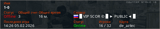 Играет на Counter Strike 1.6 сервере. Страна: РоссияПервый раз замечен 14:00 05.02.2026