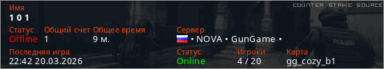 Играет на Counter Strike Source сервере. Страна: РоссияПервый раз замечен 09:35 08.03.2026