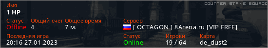 Играет на Counter Strike Source сервере. Страна: РоссияПервый раз замечен 20:11 27.01.2023