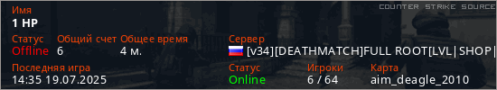Играет на Counter Strike Source сервере. Страна: РоссияПервый раз замечен 14:09 19.07.2025