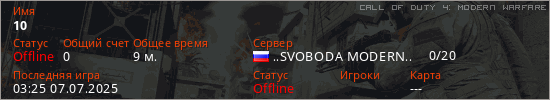 Играет на Call of Duty 4: Modern Warfare сервере. Страна: РоссияПервый раз замечен 11:23 06.02.2025