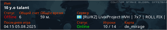 Играет на Counter Strike Global Offensive сервере. Страна: КазахстанПервый раз замечен 03:14 29.07.2025