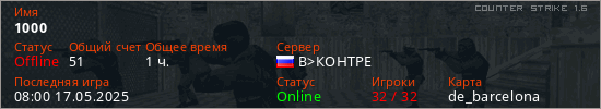 Играет на Counter Strike 1.6 сервере. Страна: РоссияПервый раз замечен 14:55 31.07.2020