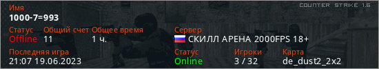 Играет на Counter Strike 1.6 сервере. Страна: РоссияПервый раз замечен 13:28 16.06.2023