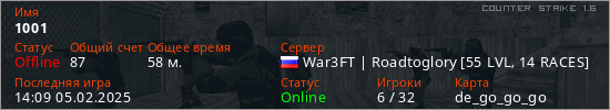 Играет на Counter Strike 1.6 сервере. Страна: РоссияПервый раз замечен 04:36 03.11.2021